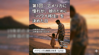 19年前に娘を連れてハワイ移住した父親による、バイリンガル教育の長期追跡ドキュメント。機内で聞いた娘の「ワラ」という発音をきっかけに、当時の移住の決断と20年後のリアルな「答え合わせ」を振り返ります。親ができる環境づくりと、その結末に迫る全15回の連載スタート。