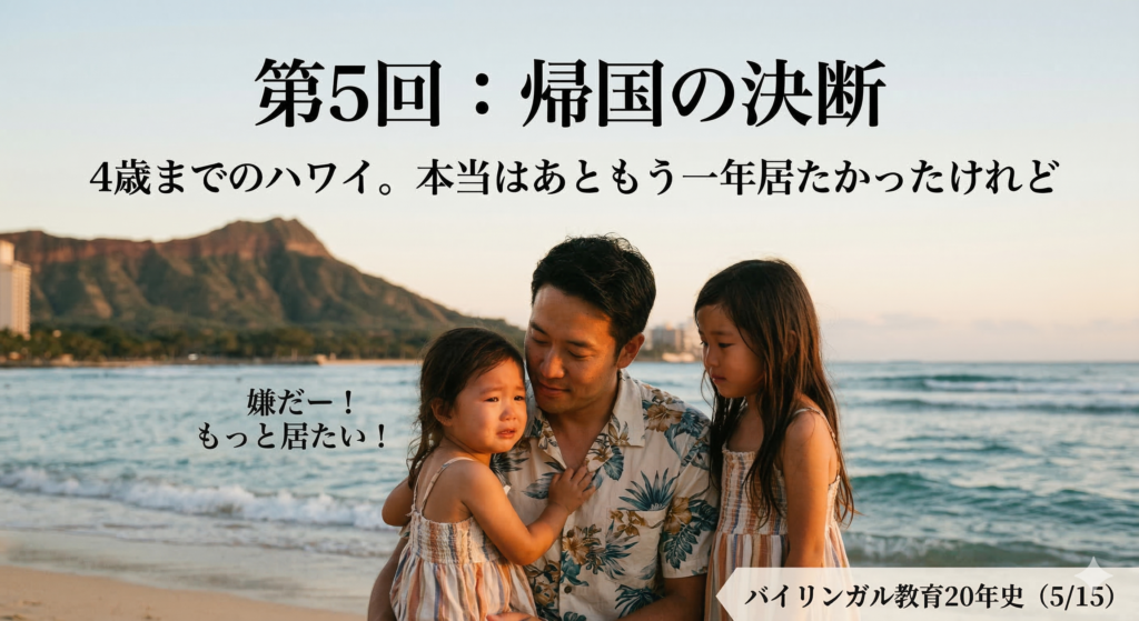 もし滞在を延ばしていたら、英語はより強固になったでしょう。しかし同時に、「日本語の根っこ」がハワイの土壌に入り込みすぎ、帰国時の摩擦が耐え難いものになったかもしれません。特に4歳という時期は、言葉が単なる音から「思考」や「概念」と結びつき始める重要なフェーズです。
